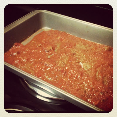 The last step is to cover them all with the leftover pasta sauce. You could also add cheese on top if you'd like : )