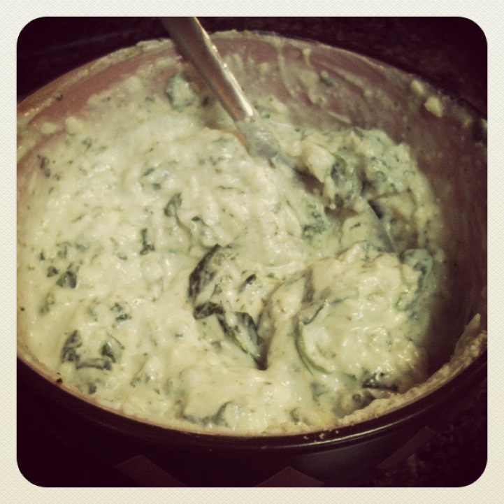 Once you've done that, mix the chicken, cheeses, milk, pepper, and 1/2 box of spinach together.