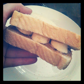 | Peanut butter, banana, and honey. The boy makes a mean sandwich! |