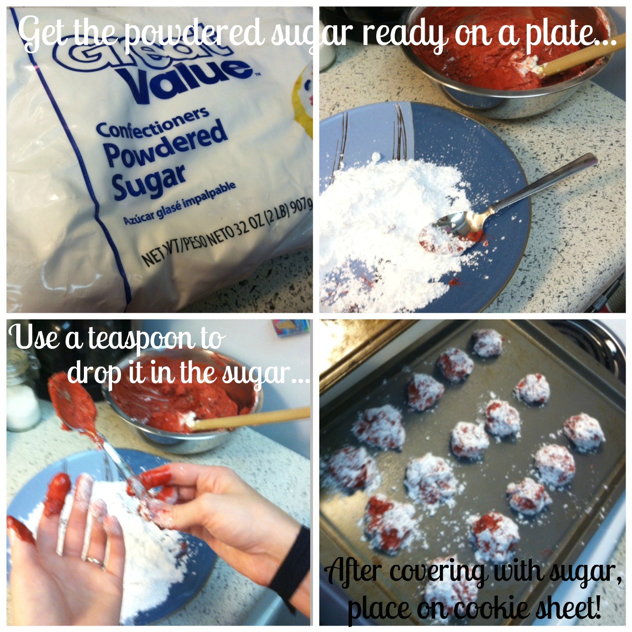 Pull out the powdered sugar and put about a cup of it on a plate (you can use a bowl if you'd like). Using a teaspoon, drop balls of batter onto the plate and roll around until covered with powdered sugar. Once they are covered, put them on a greased cookie sheet. Mine were about and inch apart.
