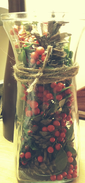 It took a few tries, but I finally got the pine cones, berries, and mistletoe greenery arranged how I liked it. Once I was finished I added twine to the vase and put it on our entryway bookshelf. I think it's a great little addition with the wreath and holiday candle.