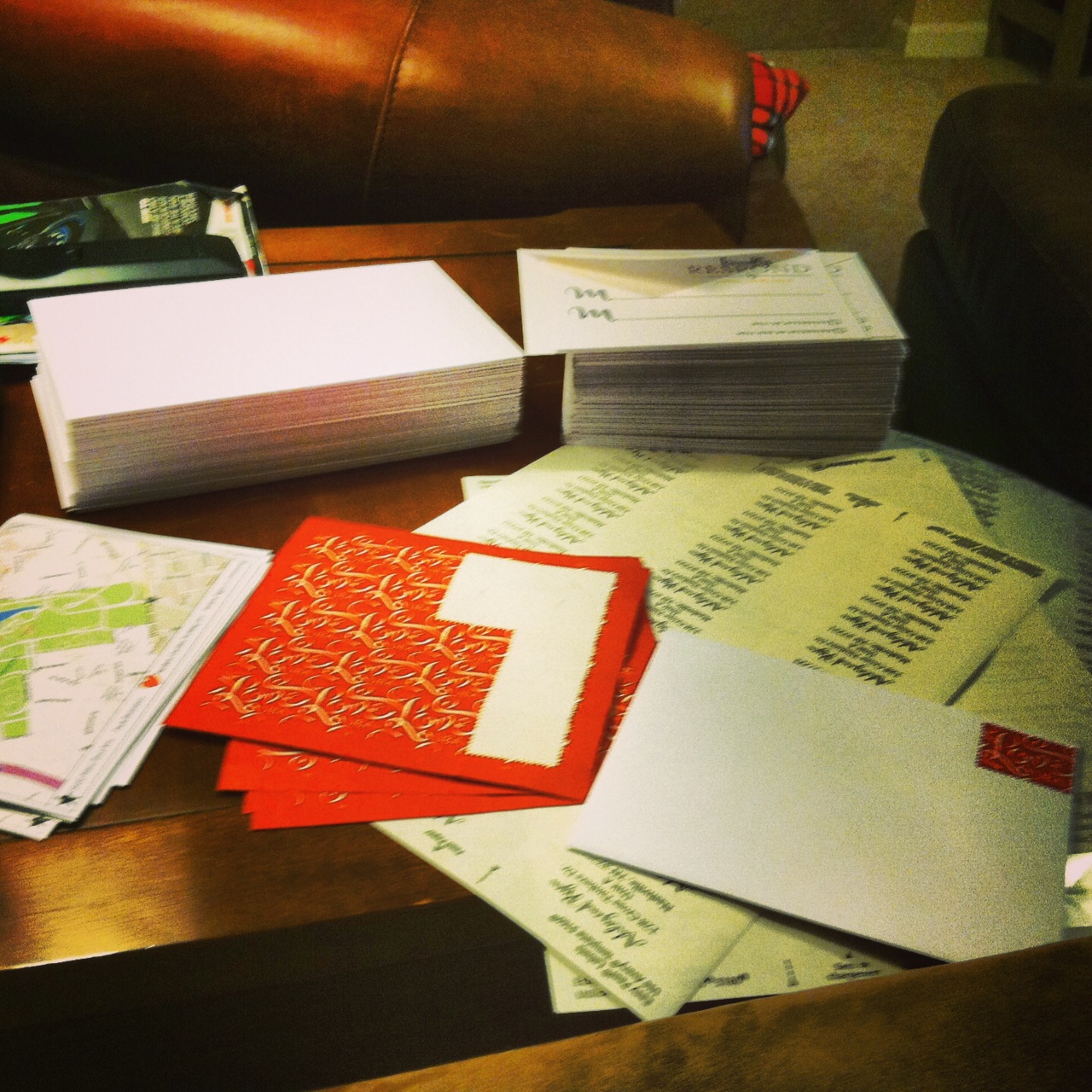 Nothing terribly overwhelming. Not to you at least ;) We stuffed our wedding envelopes and marked a few other important wedding related items off of our checklist. It feels good to be getting so many things done! Only 3 months to go!!